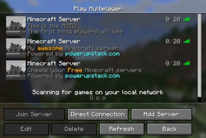 The Message of the Day (MOTD) is a short text snippet shown beneath your server's name in the multiplayer server list. It can span up to two lines, making it a great place to add flair, branding, or a welcome message.